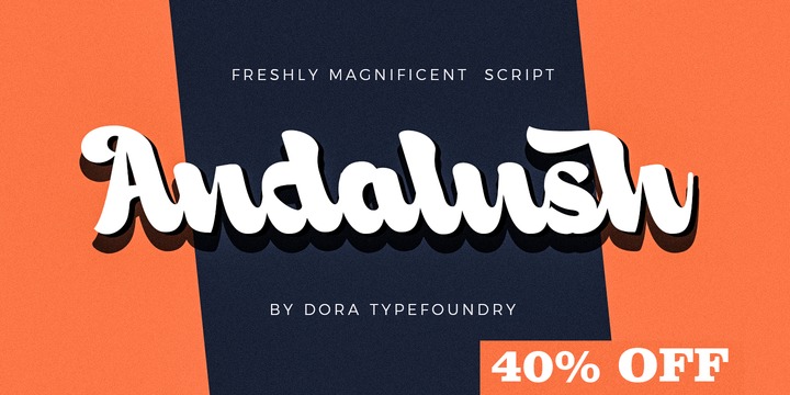 Andalush is a new type of bold script that is modern and elegant designed with a sense of pleasure, Andalush is suitable for use in various media such as; packaging, logos, labels, posters, clothing designs, wisdom quotes, newsletters, typography and many other media. You can mix and match alternatives with the OpenType feature.
